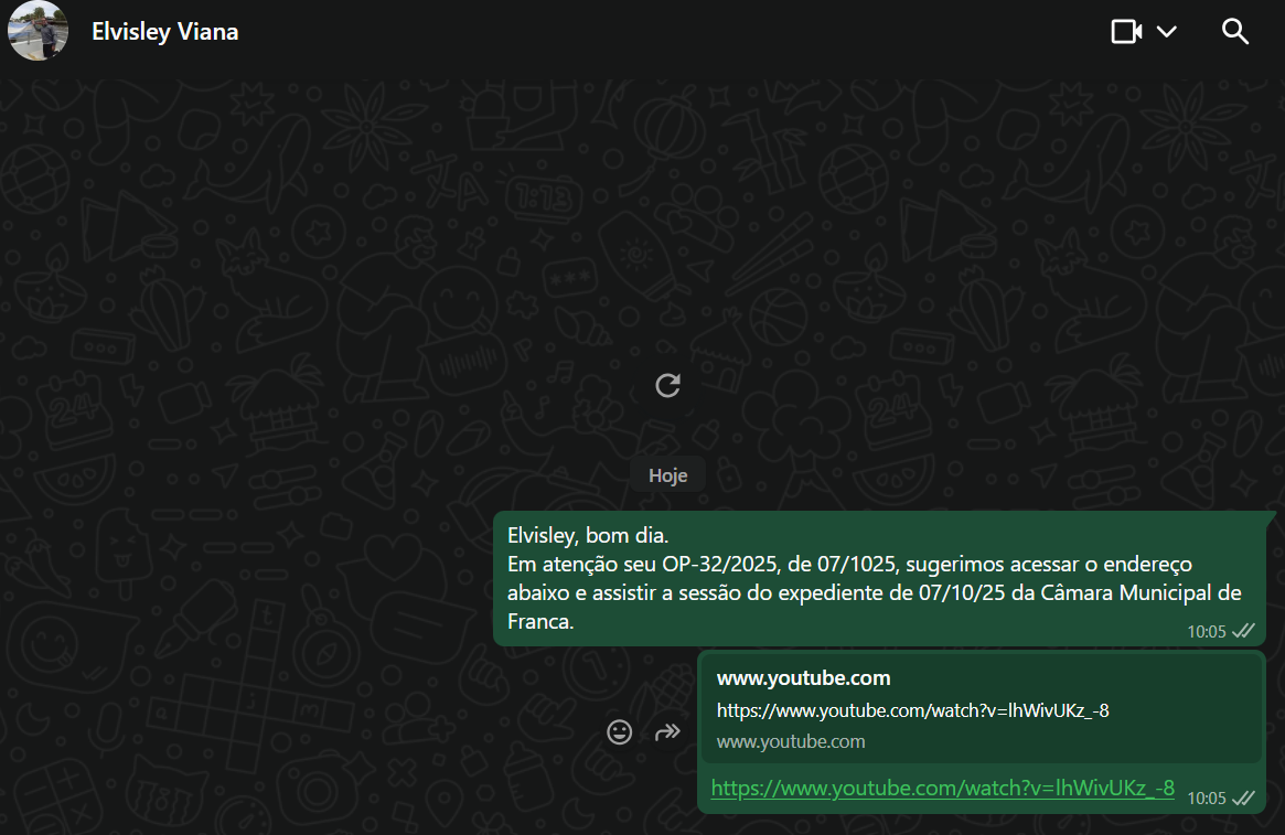| PNG | 08/10/2025 - 10:21:38 | C**** L****d* G****a | Mensagem enviada ao Sr. Elvisley Viana, via whatsaap em 08/10/25 |